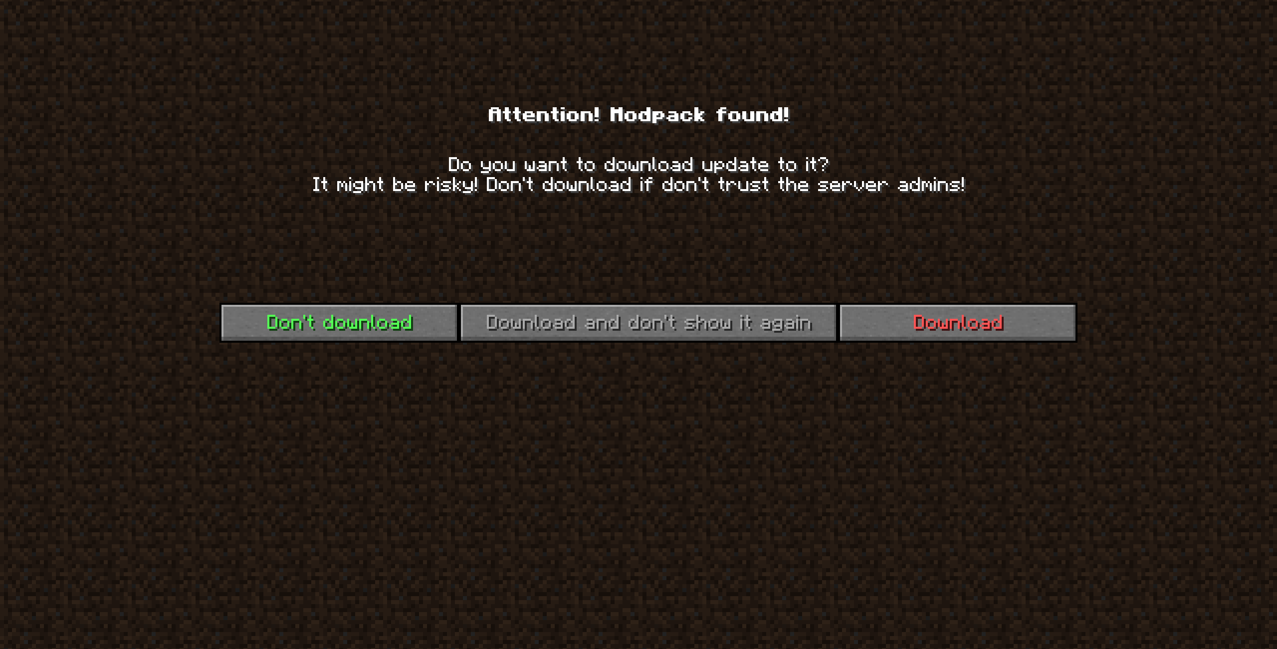 fabric-loader-1.20.4profile. - Connect to the server. When you join, you’ll be prompted with a message asking you to download mods and to restart your game, select